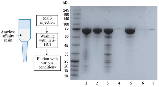 Intriguingly, MalS has a strong ability to bind to oligosaccharides and polysaccharides. It has been discovered that MalS has high affinity for amylopectin and glycogen. To confirm MalS’s ability to bind to these substrates, the enzyme was loaded onto an amylose resin and then eluted using Tris-HCl buffer containing maltose, glycogen, or amylopectin. The SDS-PAGE results showed that MalS was eluted from the amylose resin by amylopectin and glycogen. When only Tris-HCl buffer was used as the eluent, MalS was still bound to the resin, and the enzyme was not detected in the elution (Figure 2).