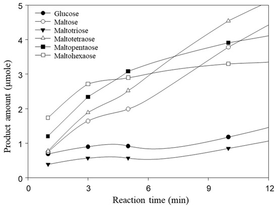 For understanding hydrolysis by MalS, an enzyme reaction with amylopectin (0.065 U/mg each substrate) was carried out at 50 °C in 50 mM MOPS (pH 7.0) containing 5.0 mM CaCl2 and sampled using the time-lapse method. The products were determined using HPAEC, as previously described with slight modifications. After column equilibrium with 150 mM NaOH, the samples were eluted with a gradient of 600 mM NaOAc in 150 mM NaOH at 1 mL/min [53]. The amount of each product was measured using the standard curve for each degree of polymerization under identical conditions.
