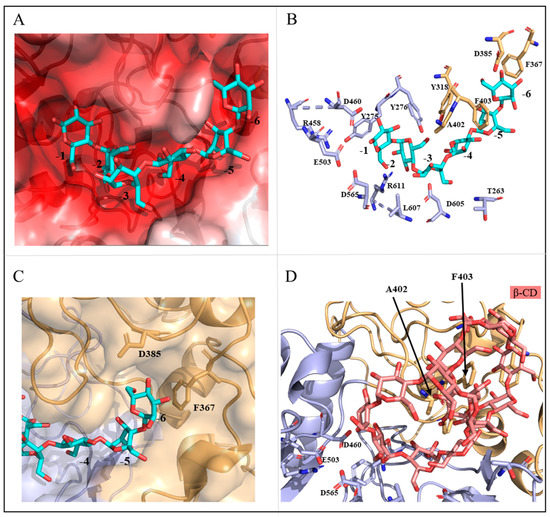 Structural analysis of catalytic residues in MalS. (A) Shows the charge distribution of the substrate binding pocket; (B) Displays the substrates and surrounding residues within the binding pocket of MalS; (C) Identifies the key residues involved in the binding of maltohexaose at the -6 subsite; (D) Depicts the possible binding sites of β-CD (salmon).
