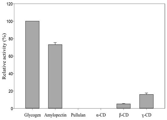 The relative activity of MalS was also determined on amylopectin, glycogen, pullulan, γ-CD, β-CD, and α-CD for comparison. The enzyme was reacted with each substrate for 10 min at 50 °C in 50 mM MOPS (pH 7.0) containing 5.0 mM CaCl2. The highest activity of MalS was considered the maximal relative activity [46,47].