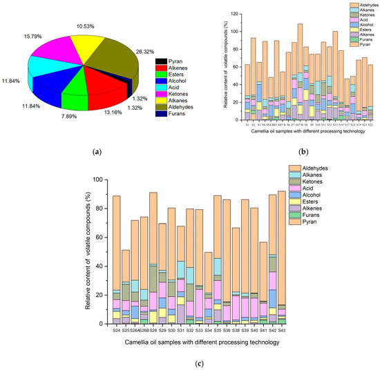 The composition and content of volatile compounds in all Camellia seed oil (a) and single sample (b,c).