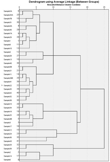 In our analysis, we consider the principal components based on the eigenvalues which are shown in Table 2. Considering this rule, we extracted seven principal components. The principal components PC1 and PC2 produced 42% of the variance explanation, while PC3 produced 4.29% (Table 2). The PCA with seven factors (nearly 67% of the total variance) discriminates between the 41 samples, which leads us to conclude that it is possible to successfully differentiate samples from different samples according to their compounds. According to the ‘scree plot’ presented in Figure 2, a total of seven clusters were formed. The 1st cluster included samples 5A, 7B, 26A, and 31, while samples 1, 4A, 7A, 8, 10, 29, and 30 were included in the 2nd cluster. The samples 9, 13, 28, and 40 were included in the 3rd cluster, and the 4th cluster included samples 5B, 11, 21, 22, 26B, 32, 35, 38, 41 and 42. The 5th and 6th cluster included the set of samples 3, 4B, 17, 18, 19, 25, 34, and 12, 24, 36, and 43, respectively, while the last 7th cluster included samples 2, 6, 14, 33, and 39.