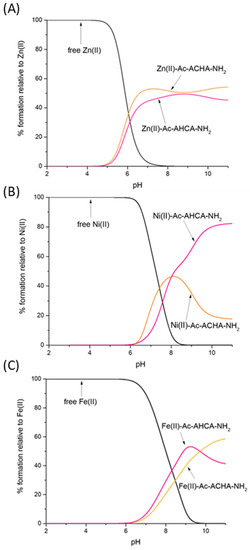 The results of this work allowed us to come to the following conclusions: (i) The position of His and Cys residues affects the stability of the complexes with Ni(II), but not those with Zn(II) and Fe(II). Ni(II) will more likely bind to Ac-AHCA-NH2 than to Ac-ACHA-NH2 above pH 8.0, when amide nitrogen atoms begin to take part in coordination (Figure 6A,B). (ii) His–Cys and Cys–His ligands do have a strong metal preference; up to pH 8.5, Zn(II) complexes are clearly the strongest ones. At alkaline pH (above 9.0), in which amides start to bind Ni(II), the square planar Ni(II) species become strongest. Fe(II) complexes are the weakest ones, thus obeying the Irving–Williams series (Figure 6A,B). (iii) Non-binding residues have a clear enhancing effect on the stability of Ni(II) complexes, most likely through shielding the central Ni(II) ion from surrounding solvent molecules.