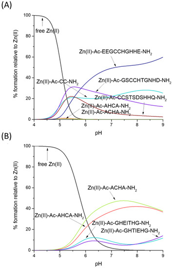 Competition plot between the Zn(II), Ac-AHCA-NH2, Ac-ACHA-NH2 peptides and (A) Ac-CC-NH2, Ac-GSCCHTGNHD-NH2, Ac-EEGCCHGHHE-NH2, Ac-CCSTSDSHHQ-NH2 [56] vs. (B) Ac-GHEITHG-NH2, Ac-GHTIEHG-NH2 [57]. The plot describes complex formation at different pH values in a hypothetical situation in which equimolar amounts of all reagents are mixed.