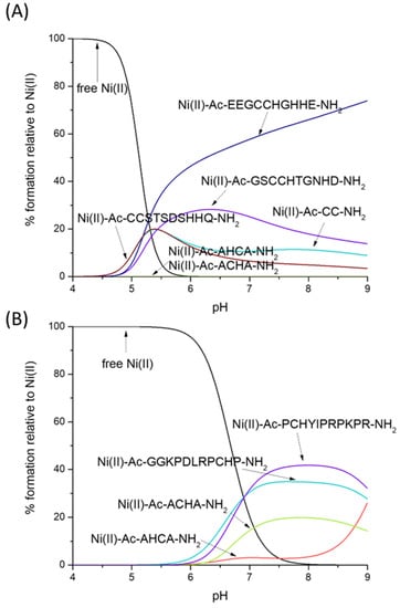 Competition plot between the Ni(II), Ac-AHCA-NH2, Ac-ACHA-NH2 peptides and (A) Ac-CC-NH2, Ac-GSCCHTGNHD-NH2, Ac-EEGCCHGHHE-NH2, Ac-CCSTSDSHHQ-NH2 [56] vs. (B) GGKPDLRPCHP-NH2, PCHYIPRPKPR-NH2, PCHPPCHYIPR-NH2 [58]. The plot describes complex formation at different pH values in a hypothetical situation in which equimolar amounts of all reagents are mixed.