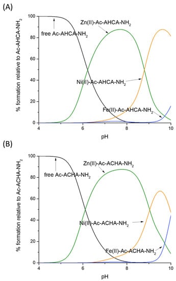 Competition plot between (A) the Ac-AHCA-NH2 peptide, Zn(II), Ni(II) and Fe(II) vs. (B) the Ac-ACHA-NH2 peptide, Zn(II), Ni(II) and Fe(II). The plot describes complex formation at different pH values in a hypothetical situation in which equimolar amounts of the three reagents are mixed. Calculations are based on constants from Table 1.