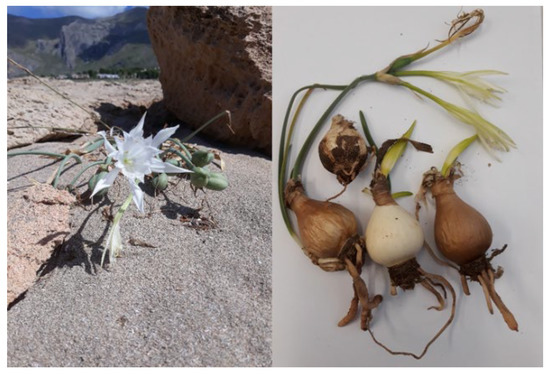 Pancratium maritimum L. (marine narcissus, sea daffodil) (Figure 1) is a bulbous perennial plant with a long neck and glaucous, broadly linear leaves, evergreen, but the leaves often die back during hot summers. The white flowers (3–15 in an umbel) are long, up to 15 cm, with a corona two-thirds as long as the tepals. It flowers from August up to October [4,5].