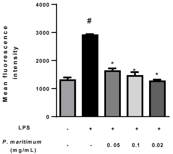 Effect of P. maritimum bulbs’ extract on intracellular reactive oxygen species (ROS) production in lipopolysaccharide (LPS)-stimulated differentiated Caco-2 cells. Intracellular ROS was analyzed using fluorescent probe H2DCF-DA in cells untreated (negative control (−)), treated with only 0.1 mg/mL LPS ((+) positive control), or co-treated with P. maritimum bulbs’ extract (0.05–0.2 mg/mL) and with LPS (0.1 mg/mL) for 24 h. The ROS production was determined as mean fluorescence intensity of dichlorofluorescein (DCF). The data were represented as means ± SEM of three independent experiments. Confidence intervals calculated by one-way ANOVA and Tukey post hoc test: # significant vs. untreated control cells: p < 0.001; * significant vs. LPS-treated cells: p < 0.001.