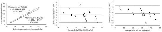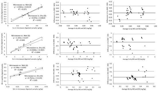For the minor minerals, the limits of agreement were slightly higher and no specific trend was observed for any of the digestion methods. Of all the minor minerals, Zn showed the highest bias (−1.85 and −5.05 mg/kg) and LOA (−11.47 and 1.35 mg/kg) (Table 3; Figure 1). The measured values for minor minerals in cheese fell within the LOA (Figure 1 and Figure 2) but the samples showed a lower correlation coefficient (Table 3) and significant differences in the values (p < 0.05) (Table 2). Cu (R2-0.971), Fe (R2-0.945) and Zn (R2-0.975) showed higher correlation coefficients for microwave vs. wet digestion, but wider LOAs indicate that large measurement errors could occur. These differences could be attributed to the ineffectiveness of ICP-OES for measuring minor minerals in cheese. An inter-lab collaborative study focused on the determination of minerals and trace elements in dairy products reported acceptable accuracy and precision for Ca, K, Mg, Na and P, but not for Cu, Fe, Zn and Mn due to their lower concentrations in dairy products []. Inductively coupled plasma-mass spectroscopy (ICP-MS) equipped with a collision/reaction cell showed better accuracy and reproducibility in testing the lower concentrations of Cu, Fe, Zn and Mn in dairy products (cheese, butter, infant formula, dairy powders) []. Both the above studies suggested the use of ICP-MS or graphite furnace atomic absorption spectroscopy (GF-AAS) for the quantification of these trace minerals.