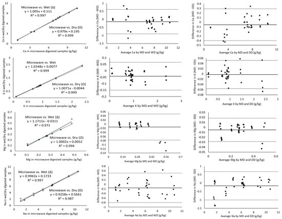 Correlation of major minerals as measured by ICP-OES for microwave vs. wet (Δ) and microwave vs. dry (O) digested cheese samples (column 1), Bland–Altman plots of the major mineral measurements by microwave digestion (MD) and wet digestion (WD) (column 2) and Bland–Altman plots of the major mineral measurements by microwave digestion (MD) and dry digestion (DD) (column 3). For all the Bland–Altman plots, the solid black line represents the observed mean agreement (bias) between methods and dashed lines above and below the solid black line represent the upper and lower limits of agreement, respectively. (Limits of agreement = bias ± (1.96 × standard deviation)).