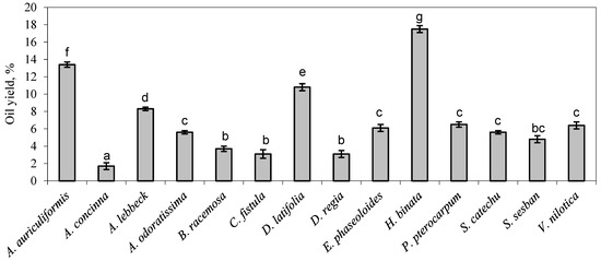 Most of the species provided low or very low oil yield (1.7% in A. concinna to 8.3% in A. lebbeck), but D. latifolia (10.8%), A. auriculiformis (13.4%) and H. binata (17.5%) exceeded 10% oil yield. The oil content does not qualify any of the tested species as viable oilseeds or raw material for biodiesel production, although the fatty acid make-up is favourable. The oil yields are lower than observed in previous reports, for example, Adweuyi et al. [30] produced a 7.0% and 8.1% oil yield from D. regia and P. pterocarpum, while only 3.1% and 6.5% were produced in the present study. There are two possible explanations for the lower oil yield: lower fat content in the seeds used for analysis or lower extraction efficiency and recovery of the method used for oil extraction. Fat content varies between individuals and can be affected by climatic and abiotic factors [31]—salt, drought and other stresses hinder photosynthesis, resulting in lower fat content as well. Oil yield from analysed samples is shown in Figure 1.