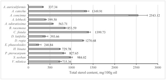 The sterol and squalene content of analysed seed oils is provided in Table 4 and total sterol content in depicted in Figure 2. In almost all of the oils, β-sitosterol dominated, except for S. catechu, in which Δ5-stigmasterol was dominant, and S. sesban, which contained an even concentration of the two. The oils contained other sterols in comparatively minor proportions. The total sterol content was similar or lower to that in widely consumed vegetable oils [20], apart from a few: A. concinna (2543 mg 100 g−1), C. fistula (1400 mg 100 g−1), S. catechu (1350 mg 100 g−1) and D. regia (1271 mg 100 g−1). All of these, however, have a low fat content, with S. catechu possessing the highest at 5.6%.