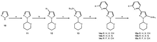 Synthesis of pyrazole-based building blocks: (a) DHP, TFA, reflux, 45 min; (b) n-BuLi, Br2, THF, −78 °C, 1 h; (c) (SnBu3)2, Pd(PPh3)4, toluene, 100 °C, overnight; (d) aryl bromide, Pd(PPh3)4, NMP, 100 °C, overnight; (e) n-BuLi, SnBuCl3, THF, −78 °C, 1 h.