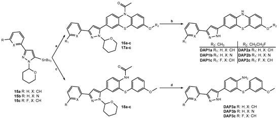 Two sets of diarylpyrazole (DAP) hybrid compounds were designed and developed based on the combination of the parent scaffolds (Figure 1) to produce a new class of compounds with promising αSYN binding. Bromo-substituted SIL5 (3) and SIL26 (5) analogs were synthesized by the NiCl2-catalyzed reduction of the nitro group into a primary amine followed by bromination, using t-BuONO and CuBr2 (Scheme 1) [25,26]. The 3-bromo phenothiazines were reacted in Pd(PPh3)4-catalyzed cross-couplings with diversely substituted THP-protected 3-aryl stannylpyrazoles followed by acidic deprotection to produce a small library of novel derivatives (Scheme 2 and Scheme 3). Their binding properties were evaluated through competition binding assays against [3H]SIL26 and [3H]MODAG−001 on human recombinant αSYN fibrils and synthetic Aβ1-42 fibrils. The in vitro results reported in Table 1 show that DAP hybrids have a significantly lower affinity towards αSYN than both parent scaffolds, with a minimum of 6-fold reduction compared to SIL26 and a 117- to 848-fold decrease compared to MODAG−001 [11,18]. These findings disprove our hypothesis of enhanced binding properties resulting from the combination of pharmacophores from SIL and MODAG structures.