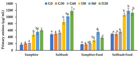 In vitro protein digestibility of samphire, saltbush, and test food digesta samples. Data are means ± SD (n = 6). G0, G30, and G60: gastric phase at 0, 30, and 60 min; I30, I60, and I120: intestinal phase at 30, 60, and 120 min. Means with different letters indicate significant (p < 0.05) differences.