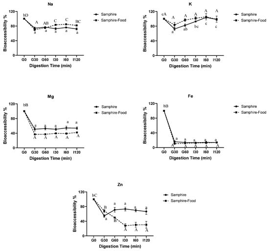 In vitro bioaccessibility of selected minerals and trace elements in samphire and samphire test food digesta samples. Data are means ± SEM (n = 6). Means with different letters indicate significant (p < 0.05) differences.