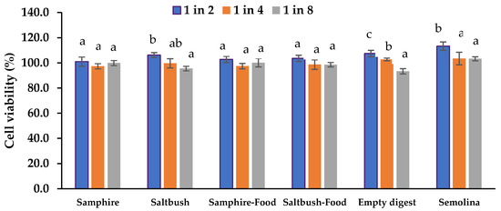 Effects of the halophyte digesta samples on Caco-2 and HT29-MTX-E12 co-culture cell viability in vitro using CyQUANTR cell proliferation assay. Data are means ± SEM (n = 6). Cell viability is expressed as a percentage compared to the HBSS control. Empty digests: digestive electrolytes and enzymes; Semolina: semolina, digestive electrolytes, and enzymes. Means with different letters indicate significant (p < 0.05) differences.