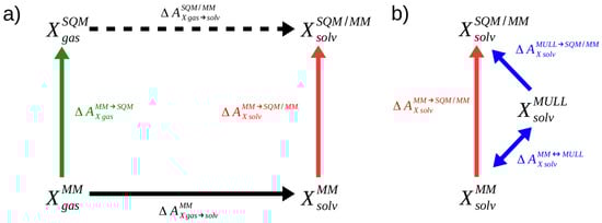In addition to computing the solvation free energy at the force field (MM) level of theory (solid black arrow), two correction steps, accounting for the free energy difference of X in the gas phase and the aqueous solution between the two levels of theory (green and red arrows), are required. The development in this field over recent years shows that there is not only enormous potential, but also a high degree of interest in the FES community to use this strategy to compute free energy differences at the SQM/MM levels of theory [19,20,21,22,23,24,25,26,27].