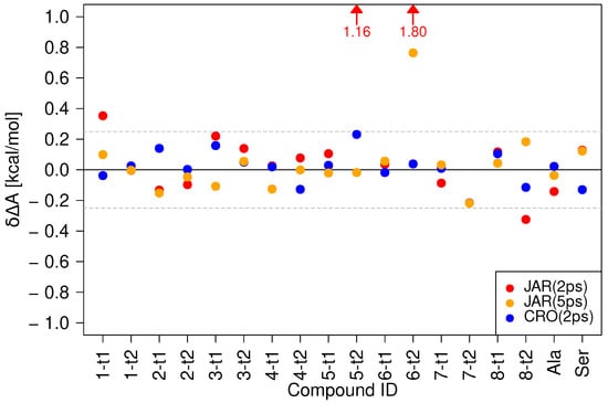 Comparison of using three protocols without intermediate state: JAR(2ps): 2 ps forward switches from MM to SQM, JAR(5ps): 5 ps forward switches from MM to SQM, and CRO(2ps): 2 ps forward and backward switches. In all cases, the CRO results obtained from 5 ps switches were considered as the reference values CRO. For 5t-2 and 6t-2, the JAR(2ps) results are off-scale, which is indicated by the red arrows.