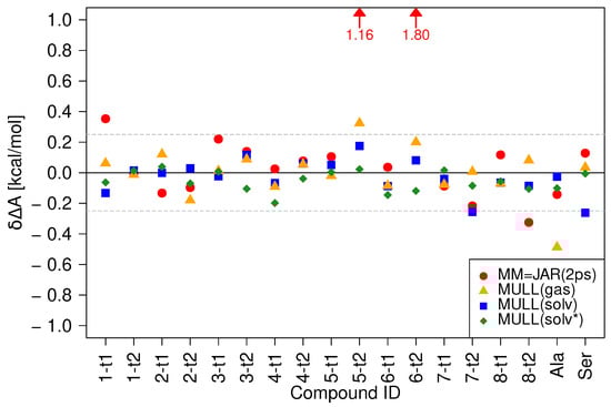 Clearly, all three protocols employing an intermediate hybrid charge state perform much better than the direct NEW switches (MM), though not to the same degree. Using the MULL(gas) intermediate state (orange triangles), the kcal/mol threshold for 5-t2 is still missed, kcal/mol, and the result for Ala becomes worse ( kcal/mol). For MULL(solv), the blue squares, all results lie de facto within the kcal/mol threshold ( kcal/mol, kcal/mol). It should be noted that taking the statistical uncertainty of the results into account, none of these deviations from the kcal/mol threshold are statistically significant. Finally, all MULL(solv*) results (green diamonds) lie well within the kcal/mol threshold.