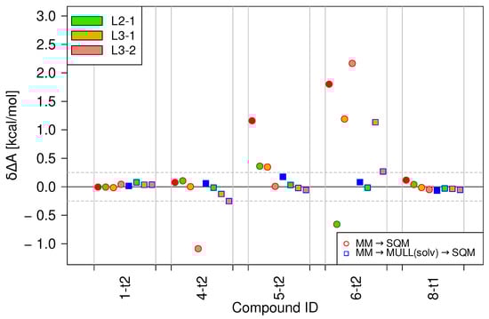 The partial charges of the intermediate hybrid states were obtained by averaging over the Mulliken charges obtained from 200 energy evaluations at the SQM level of theory. The computational cost of this is relatively small; the overhead, if any, comes from sampling the configurations over which one averages in the first place. Not surprisingly, the best results (lowest overall ; see Table 1) were obtained from coordinate sets generated during SQM/MM simulations, i.e., calculations at the target high level of theory (MULL(solv*)). While we have performed such calculations to obtain reference results with CRO, we would ideally prefer to avoid them in practical applications. In contrast, the cheapest approach is to use the coordinate sets saved during the MM gas phase simulations (MULL(gas)). While these results were an improvement over the direct MM→SQM/MM switches, the MAD() was higher than that of MULL(solv*). The results for the third method tested, MULL(solv), fell in between. Here, the configurations to be reevaluated at the SQM/MM level of theory were generated from the MM simulations in the solvated phase. Since one can reuse the stored coordinates/restart files to start the NEW switching simulations, the computational cost is practically zero. All results obtained with the MULL(solv) hybrid intermediate charge state met our rather stringent quality criteria; the improvements over the direct MM→SQM/MM switches were noticeable, and the difference in convergence over the more expensive MULL(solv*) approach was small (a MAD of 0.09 instead of 0.07 kcal/mol). Thus, the MULL(solv) approach to derive an intermediate charge representation seems to be a good compromise between computational cost and convergence improvement. While for this study, averaged Mulliken charges were the logical choice because of the use of SCC-DFTB, other charge assignment procedures could be explored if different QM methods were used, such as ESP or CM5-symmetrized charges [19,43]. All methods require an additional, free energy simulation to obtain at the low level of theory, but its computational cost is small compared to that of the NEW switching simulations needing SQM/MM Hamiltonians.