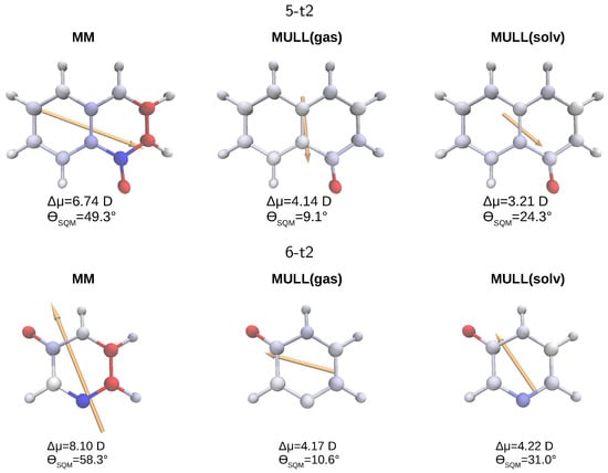 Graphical representation of differences in partial atomic charges compared to MULL(solv*) for 5-t2 (top) and 6-t2 (bottom). Charge differences are indicated as a color gradient from blue () to red (). The differential dipole moment is displayed as an orange arrow. The magnitude and the angle between the dipole moment of the respective charge distribution with that of the MULL(solv*) reference distribution are given below each structure.
