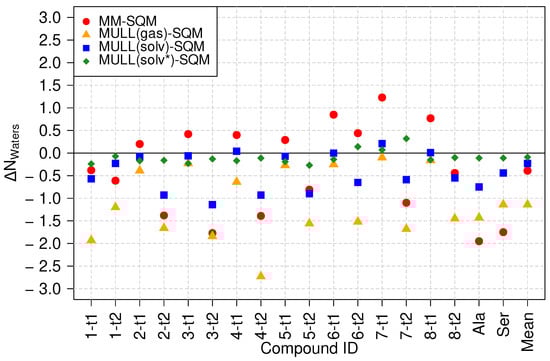Figure 6 displays the difference between the average number of waters within Å of the solute. The numbers are relative to the target high-level state, i.e., the average number of waters found in the SQM/MM simulations. First, one sees that for the MULL(solv*) charges (green diamonds), which were also derived from the SQM/MM simulations, are very close to zero, in accord with expectation. Several results for the MULL(solv) charges (blue squares) are also quite close to zero, but mostly for the lactams (particularly 2-t2, 3-t2, 4-t2, 5-t2) the difference in water molecules . For the MULL(gas) charges (orange triangles), all values are negative, i.e., on average, there are fewer water molecules in close contact with the solute, compared to SQM/MM. This is not too surprising, because the charges were derived from SCC-DFTB gas phase calculations; hence, the solute did not experience polarization from its interaction with the solvent. This may also explain why on average, the use of the MULL(gas) hybrid intermediate state performed worse than MULL(solv), even though it performed significantly better than MM (cf. Table 1).