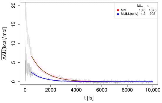 Water reorientation dynamics of TIP3P solvent for 5-t2 when switching from MM and MULL(solv) to SQM/MM. Raw data are shown in gray; fit for MM in red and fit for MULL(solv) in blue. The fit parameters ( in kcal/mol, in fs) are listed in the inset; cf. Equation (14).