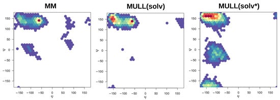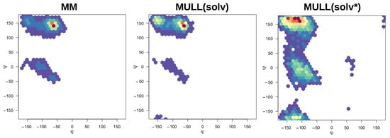 The compounds used in this work were mostly rigid and specifically chosen to avoid complications from conformational degrees of freedom, the exceptions being 1-t1 and the blocked amino acids Ala and Ser. Modifying partial charges as for the MULL hybrid intermediate states may have an effect on conformational preferences. As can be seen in Figure 3, all three MULL hybrid intermediate states improve the convergence for 1-t1. For the two blocked amino acids, MULL(gas) results in a poorer convergence for Ala, and MULL(solv) results in a slightly poorer convergence for Ser. Given that Ala and Ser are the smallest possible peptide-like molecules with protein backbone-like and dihedral angles, we performed some analyses on the dihedral angle conformational preferences. In earlier work [31], we showed that purely classical Hamiltonians and SQM/MM Hamiltonians resulted in different preferred conformations of and , as well as in the Ser case. In Figure 8 and Figure 9, maps for Ala and Ser are shown for MM, MULL(solv), and SQM. The differences between MM (left) and SQM (right) are clearly visible. For both blocked amino acids, MM has a single narrow minimum at , , whereas SQM has a broader distribution at , and . While the MULL maps (middle plots) are more similar to MM than to SQM, a second minimum at has appeared. Thus, although the effect is small, the use of hybrid charge intermediates also makes this state slightly more similar to a high-level state, in terms of conformational preferences.