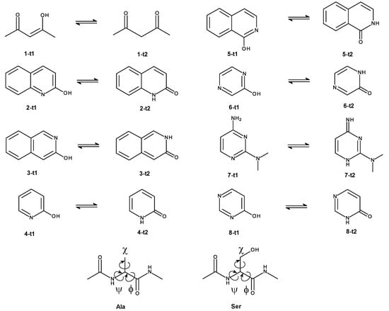 Model systems used in this work: eight tautomer pairs, seven taken from the SAMPL2 challenge [49], and one (7-t1 ⇌ 7-t2) from Tautobase [50]. In addition, we used the blocked amino acids Ala and Ser as model solutes.