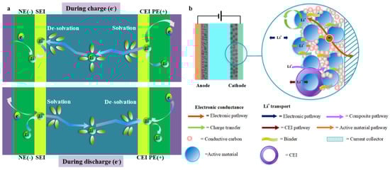 LIBs generally include a graphite anode, a layered spinel or olivine structured lithium metal oxide cathode, a porous polymer separator, a copper/aluminum current collector, and a liquid electrolyte that contains a blend of salts, organic carbonates, salts, and additives. Inside the LIB, whether inside the electrode or at the key interface, achieving reliable operation and fast charging is important [18], which depends on various parameters, including temperature and ion transmission [33]. As illustrated in Figure 1, the charging of LIBs leads to the transfer of ions from the cathode to the anode through the electrolyte. The critical processes controlling this process include ion transfer (1) via the solid electrode, (2) via the electrolyte/electrode interactions of cathode and anode, and (3) via the electrolyte, such as Li+ desolvation and solvation. In optimum situations, it would be advantageous for these main phenomena to involve battery charging [36,37]. In general, a cathode comprises an active material, a conductive carbon additive to make enough electronic conductivity, a binder, which takes a vital role in holding the structural integrity of the electrode, and an Al current collector playing the part of a substrate for the electrode coating and as an electronic conductor to the cell terminal. For layered-oxide cathodes, delithiation occurs via Li+ de-insertion and accompanying electron transport. Therefore, two types of carriers have their paths, an electron path and the Li+ ion transport path [38]. During battery charging, electrons move further from the active material particles (which may involve conductive carbon particles) to the aluminum collector and through the external circuit to the anode, thereby experiencing ohmic resistance [38,39]. The electron path is reversed during the discharge. In both directions, the electron transport should meet the same electronic resistance, and the Li+ transfer path dynamics in the composite electrode indicate differences in the charging and discharging process. During the battery charging process, Li+ ions move into the electrolyte medium through a particle surface layer and the electrode/electrolyte interface in the active material particles and dissolve before reaching the anode. The discharge path (lithiation) is the opposite but includes the desolvation process before Li+ ions enter the active material [38,40]. In an ideal situation, it would be advantageous for these phenomena to involve battery charging. However, the operating conditions of a battery may cause a series of side effects that affect its performance and life. Moreover, the thermal properties of the battery depend on various circumstances to a great extent. A high charge and discharge current, concentration polarization, or battery resistance accelerates the rate of heat production and has an adverse impact on the safety and performance of the process.