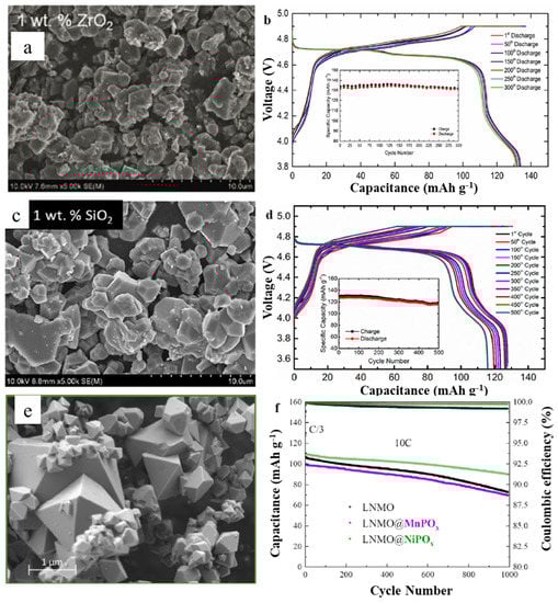 (a) SEM of 1.0 wt.% ZrO2-coated LNMO, (b) Charge/discharge profile of 1.0 wt.% ZrO2-coated LNMO charged at a 6 C rate and discharged at a C/3 rate. Reproduced with permission from [41]. Copyright 2018, Elsevier. (c) SEM of 1 wt.% SiO2 coated LNMO, (d) Charge/discharge profile of 1 wt.% SiO2-coated LNMO charged at a 6 C rate and discharged at a C/3 rate. Reproduced with permission from [42]. Copyright 2019, American Chemical Society. (e) SEM of LNMO@NiPOx, (f) Long-term constant current cycling at 10 C for 1000 cycles with LNMO, LNMO@MnPOx, and LNMO@NiPOx. Reproduced with permission from [47]. Copyright 2020, Elsevier.