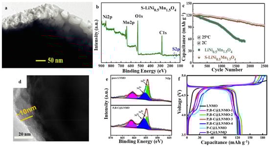 Wei et al. prepared a surface-sulfided LiNi0.5Mn1.5O4 cathode material via the electrostatic interaction between sulfide ions with a negative charge and LiNi0.5Mn1.5O4 with positive charges (Figure 4a,b). The obvious gain of surface vulcanization is the production of a 3D permeable vulcanized layer, which is conducive to the formation of a stable cathode electrolyte interphase film that improves the diffusion kinetics of Li+ on the surface. The adsorption of SO42− on the surface of LiNi0.5Mn1.5O4 and the decrease in work function caused by surface sulfidation help to enhance the rate performance and cycle life of the LiNi0.5Mn1.5O4/electrolyte interface. Consequently, a discharge capacity of 93.4 mAh g−1 was delivered at 2 C after 2500 cycles, where the capacity retention was 74.9% and was significantly greater in contrast with the pristine electrode (45.3% after 1800 cycles) (Figure 4c). Gu et al. used C24H20BNa and C24H20PBr as precursors to synthesize high-voltage LNMO coated with boron co-doped carbon and phosphorus, and this coating was shown to effectively block the electrode-electrolyte interface side reaction (Figure 4d,e) [48]. In addition, the coating improves the weak conduction property of LNMO. When compared with the uncoated LNMO electrode, the P, B, and C-coated LNMO electrodes exhibited excellent rate performance as well as high cycle capacity. In particular, the P, B–C@LNMO-3 delivered high-capacity retention of 96.7% after 200 cycles at 1 C discharge rate and 111 mAh g−1 capacity at a 5 C discharge rate (Figure 4f). Several factors were identified as contributing to the optimized electrochemical performance of the P, B–C@LNMO materials, including their resistance to attack posed by the electrolyte and a small amount of water, increased electronic conduction, and increased Li+ ion transport. The effective combination of the surface coating and doping can effectively suppress the electrode-electrolyte interface side reaction and improve the low conductivity of LNMO. This is the most effective approach for modifying the LNMO to achieve the fast-charging performance of the LNMO cathode.