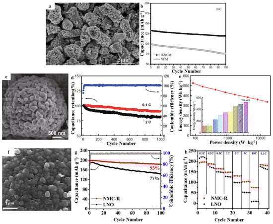 (a) SEM of H-NCM, (b) Cycling performance of H-NCM and NCM at 10 C rate. Reproduced with permission from [51]. Copyright 2019, Wiley. (c) SEM of MNC, (d) Cycling performance of assembled full cell at 0.1 C and 2 C, (e) Ragone plots based on total mass of cathode and anode. Reproduced with permission from [52]. Copyright 2020, Elsevier. (f) SEM of NMC-R, (g) Cycling performance of NMC-R and LNO at 0.5 C, (h) Rate discharge capability of NMC-R and LNO at different rate. Reproduced with permission from [53]. Copyright 2021, Springer.