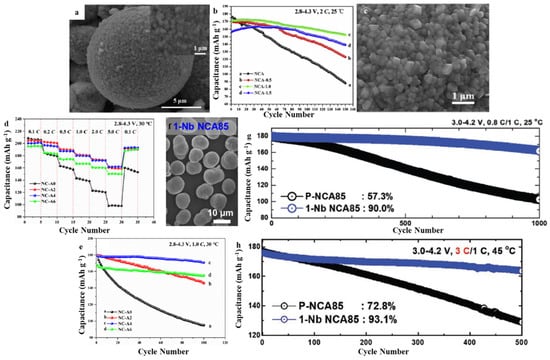 (a) SEM of NCA-1.0, (b) Rate performance of NCA, NCA-0.5, NCA-1.0, and NCA-1.5. Reproduced with permission from [64]. Copyright 2020, Elsevier. (c) SEM of NC-A4, (d) Rate, (e) Cycling, performance of NC-A0, NC-A2, NC-A4, and NC-A6. Reproduced with permission from [63]. Copyright 2021, Elsevier. (f) SEM of 1-Nb NCA85, (g) Cycling performance at 1.0 C in full cells, (h) Cycling performance at 3 C in full cells. Reproduced with permission from [26]. Copyright 2021, Wiley.