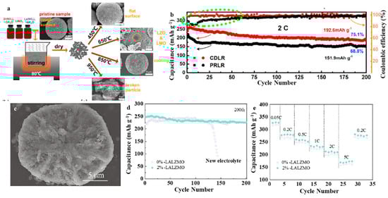 (a) Schematic illustration for m-LRM synthesized at different temperatures, (b) Cycling performance of PRLR and CDLR electrodes at 2 C. Reproduced with permission from [75]. Copyright 2021, Elsevier. (c) SEM of Li1.1P0.02Ni0.2Mn0.6O2, (d) Cycling performance, (e) Rate performance of LALZMO-coated LPMNO with coating ratios of 0 wt.% and 2 wt.%. Reproduced with permission from [76]. Copyright 2021, Elsevier.