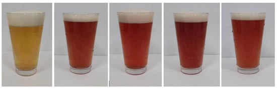 In recent years, consumers have been looking for new trends in beer styles, including increasing interest in beers other than those made from 100% barley malt and enriched with raw materials with high health-promoting effects such as fruit. Wheat beers are top-fermented products characterised by a fine, stable foam (thanks to a combination of two types of wheat and barley malt), little bitterness or haze intensity [1,2,3,4]. The palatability of wheat beers comes from the chemical compounds formed during fermentation, including phenols, aldehydes, esters and their derivatives [2,3,4]. Wheat beers are also characterised by a high content of antioxidant compounds, including polyphenols, melanoidins or vitamins [5].