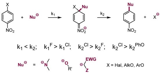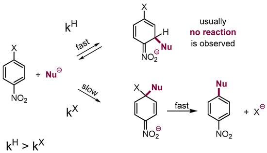 The most common and studied reaction between nucleophiles and aromatic electrophiles is substitution of halogens and other leaving groups in nitroarenes. This reaction, known for more than 150 years, proceeds via the addition of nucleophiles at positions ortho or para to the nitro group occupied by a leaving group X to form σX adducts. As was mentioned earlier, the addition is connected with dearomatization, thus the adducts undergo fast rearomatization via the departure of X− to form products of substitution, SNAr. As a consequence, in this two-step process, the addition is the slower, rate-limiting step, therefore usually the substitution proceeds faster when X = F than X = Cl [].