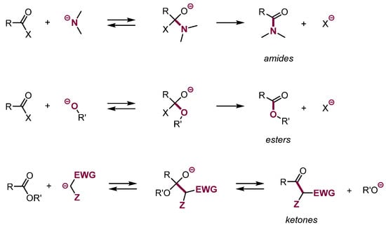 Numerous common reactions such as acylation of carbanions by acyl chlorides and esters, synthesis of esters via acylation of alcohols and transesterification, synthesis of amides, hydrazides, hydroxamic acids, etc. proceed via the addition of nucleophiles to carbonyl and amino groups substituted with a leaving group, followed by elimination of the leaving group (Scheme 4). Many names and common reactions, e.g., Claisen condensation, transesterification, etc., belong to this category. It appears difficult to see the analogy between the Claisen condensation and SNAr reaction, but indeed these reactions proceed similarly as follows: addition of nucleophile followed by elimination of a leaving group from the addition center.