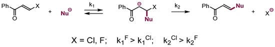 Similar to the case of aromatic electrophiles there are two main mechanistic variants of substituting chlorine in β-chlorovinyl ketones through two-step processes in which the adducts are intermediates or synchronous reaction when the dissociation is faster than addition and the adducts are transition states [,]. Occasionally, reactions other than elimination may be observed following the addition of nitrogen [,,], oxygen [,], carbon [,], or fluoride [] nucleophiles to electron-deficient fluoroalkenes, including SN2’ reactions [].