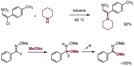The reactions of nucleophiles with π-electrophiles containing leaving groups at the electrophilic centers of electron deficient alkenes are less common. Nevertheless, there are many examples of substitution of β-halogens or β-alkoxy groups in vinyl nitriles, ketones, or sulfones that proceed via an addition–elimination mechanism analogous to SNAr [,]. Similar to the SNAr, addition is usually the rate-determining step, hence for instance substitution of fluorine is faster than chlorine (Scheme 5). Selected synthetic examples of nucleophilic substitution in aliphatic systems are presented in Scheme 6 [,,].
