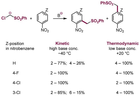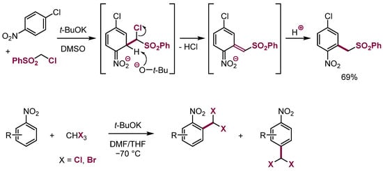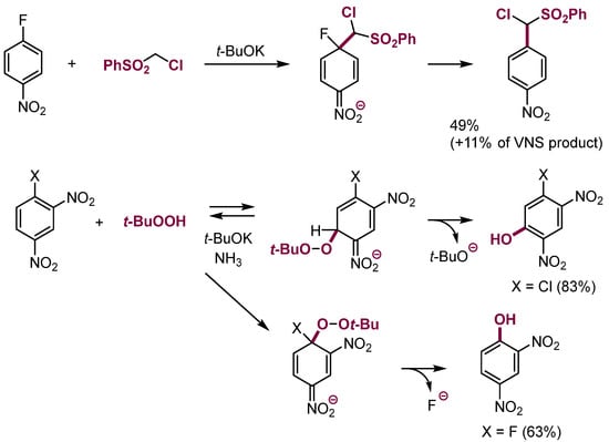 There are few examples of substitution of halogens in nitroarenes with nucleophiles containing leaving groups, e.g., α-chlorocarbanions, mostly because nucleophilic addition to such arenes proceeds faster from the position occupied by hydrogen. The formed σH adducts of α-chlorocarbanions usually undergo β-elimination to form products of vicarious nucleophilic substitution (VNS) [] faster than dissociation and addition at positions occupied by a leaving group (see below, Section 3.2). Nevertheless, there are examples of substitution of halogens, particularly fluorine, in fluoronitrobenzenes by carbanions of α-chloroalkyl sulfones [,], alkoxynitriles, sulfenamides, and anion of t-butylhydroperoxide (Scheme 7) []. These reactions have rather limited practical application.