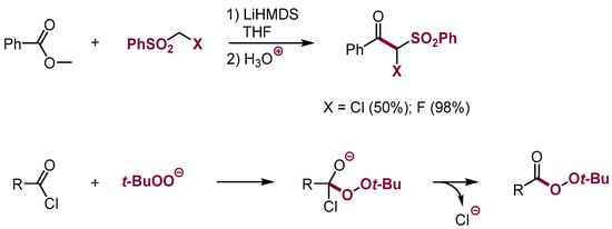 - Ni, C.; Zhang, L.; Hu, J. Synthesis of Fluorinated β-Ketosulfones and gem-Disulfones by Nucleophilic Fluoroalkylation of Esters and Sulfinates with Di- and Monofluoromethyl Sulfones. J. Org. Chem. 2009, 74, 3767–3771. [Google Scholar] [CrossRef]