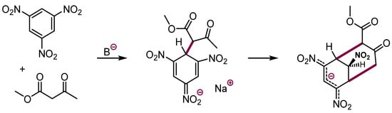 Carbanions generated from 1,3-dicarbonyl compounds add to such nitroarenes to form upon protonation peculiar bicyclic products in moderate yields (Scheme 10) []. These important and interesting observations have limited application in organic synthesis.