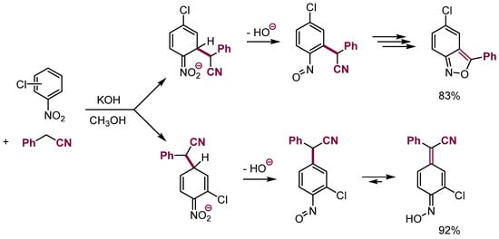 - Mąkosza, M.; Sulikowski, D. Multiple Reaction Pathways between the Carbanions of α-Alkoxy-α-phenylacetonitrile and o-Chloronitrobenzene. Eur. J. Org. Chem. 2011, 2011, 6887–6892. [Google Scholar] [CrossRef]