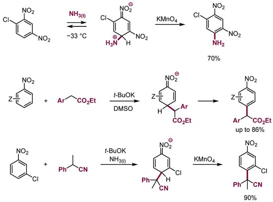 - Błaziak, K.; Danikiewicz, W.; Mąkosza, M. How Does Nucleophilic Substitution Really Proceed in Nitroarenes” Computational Prediction and Experimental Verification. J. Am. Chem. Soc. 2016, 138, 7276–7281. [Google Scholar] [CrossRef] [PubMed]