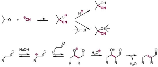 Further, adding nucleophiles to aliphatic π-electrophiles containing carbon-heteroatom double bonds that do not contain leaving groups is energetically favorable; hence, the usual protonation of the adducts provides stable products. This can be exemplified by the addition of cyanide anion to aldehydes and ketones that upon protonation form cyanohydrines or silylation O-silylated cyanohydrines (Scheme 15) [,]. Similarly, the addition of carbanions to aldehydes and ketones followed by protonation gives aldol-type products.