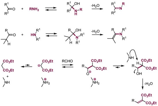 Usually, the protonated adducts—aldols—enter fast further reactions, most often elimination of water to form alkenes (Knoevenagel reaction) []. Additionally, adding ammonia and a variety of amines to aldehydes and ketones results in the formation of aminals and subsequently, upon elimination of water, aldimines or enamines (Scheme 16).
