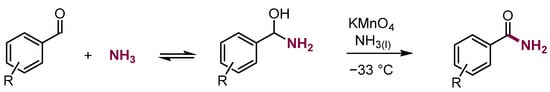 - Antoniak, D.; Sakowicz, A.; Loska, R.; Mąkosza, M. Direct Conversion of Aromatic Aldehydes into Benzamides via Oxidation with Potassium Permanganate in Liquid Ammonia. Synlett 2015, 26, 84–86. [Google Scholar] [CrossRef]