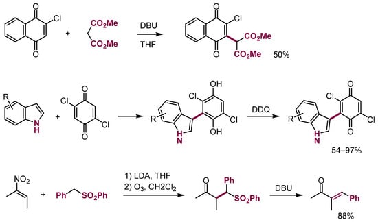 Formally, the oxidation of protonated adducts of RLi and RMgX to aldehydes, that is alcohols, may be viewed as another example belonging to this category. ONSH reaction also proceeds with electron-deficient alkenes, for example, in quinone or maleimide derivatives [,,,,,] or even nitroalkenes [] (Scheme 18).